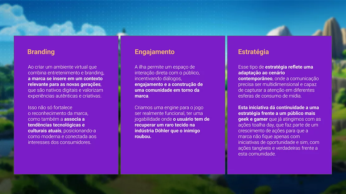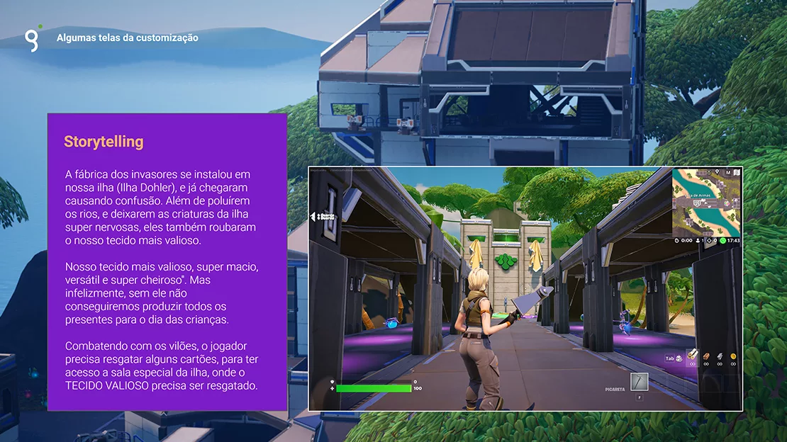 Um diferencial para esta campanha é não nos mantermos apenas neste universo pela identidade visual, e sim, mergulharmos nela, propondo uma experiência imersiva com a marca. Criamos então uma ilha no jogo Fortnite, jogo conhecido por sua vasta base de jogadores, uma abordagem inovadora para ampliar o alcance da marca em um público que tradicionalmente não seria atingido pelos meios convencionais trazendo um caráter inovador e jovem.